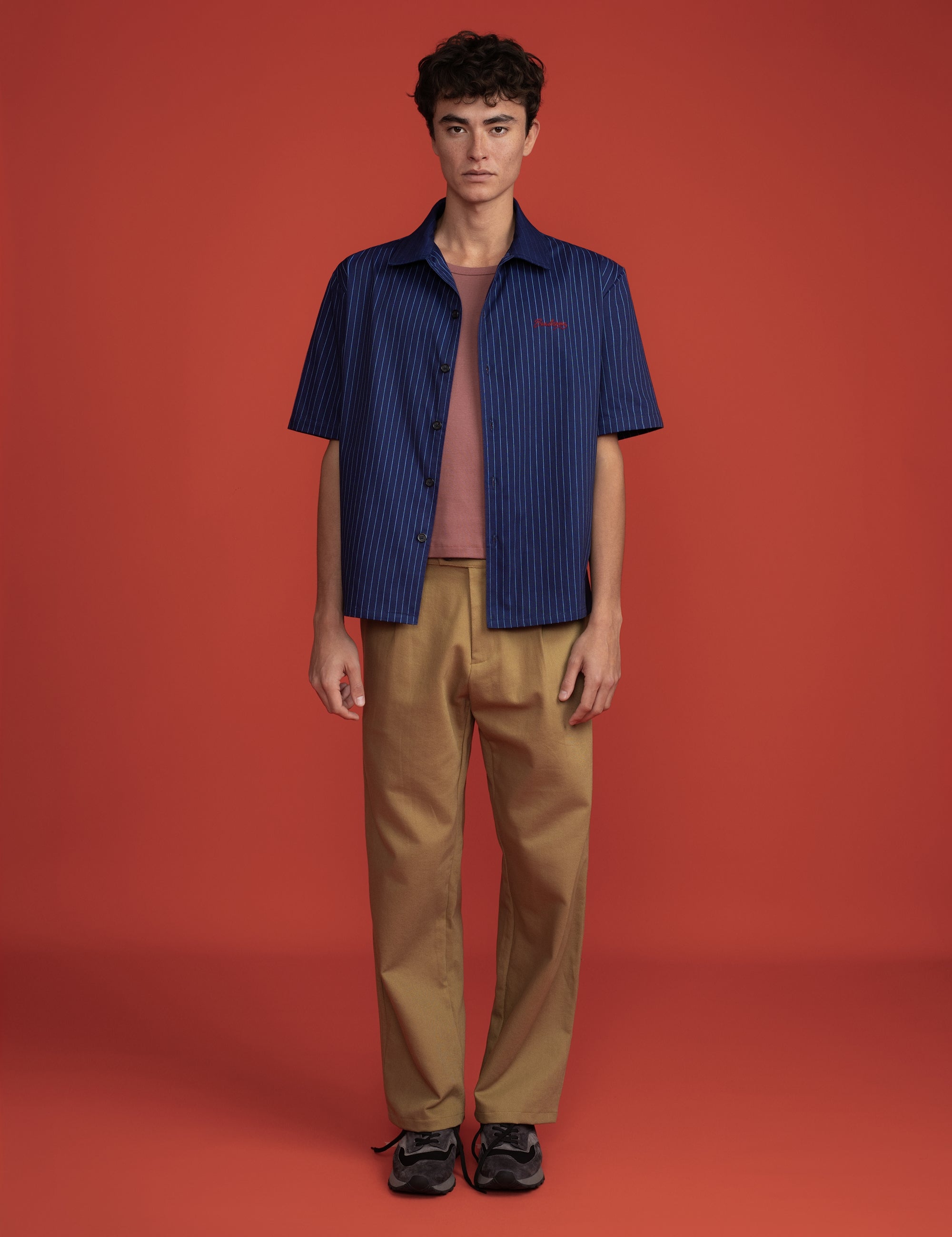 SS Button Shirt Navy Pinstripe Logo
