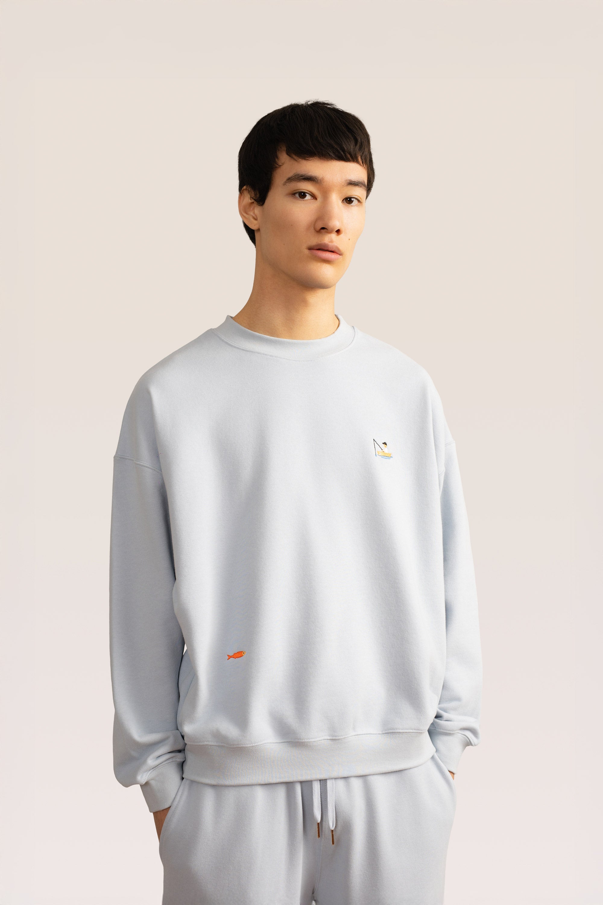 Oversized French Terry top crafted from heavy 402gsm unbrushed 100% Japanese cotton. Designed with a relaxed drop-shoulder fit and finished with thick rib on the cuffs and hem. Fisherman and fish embroidery.