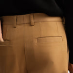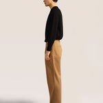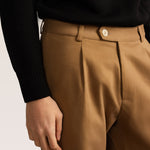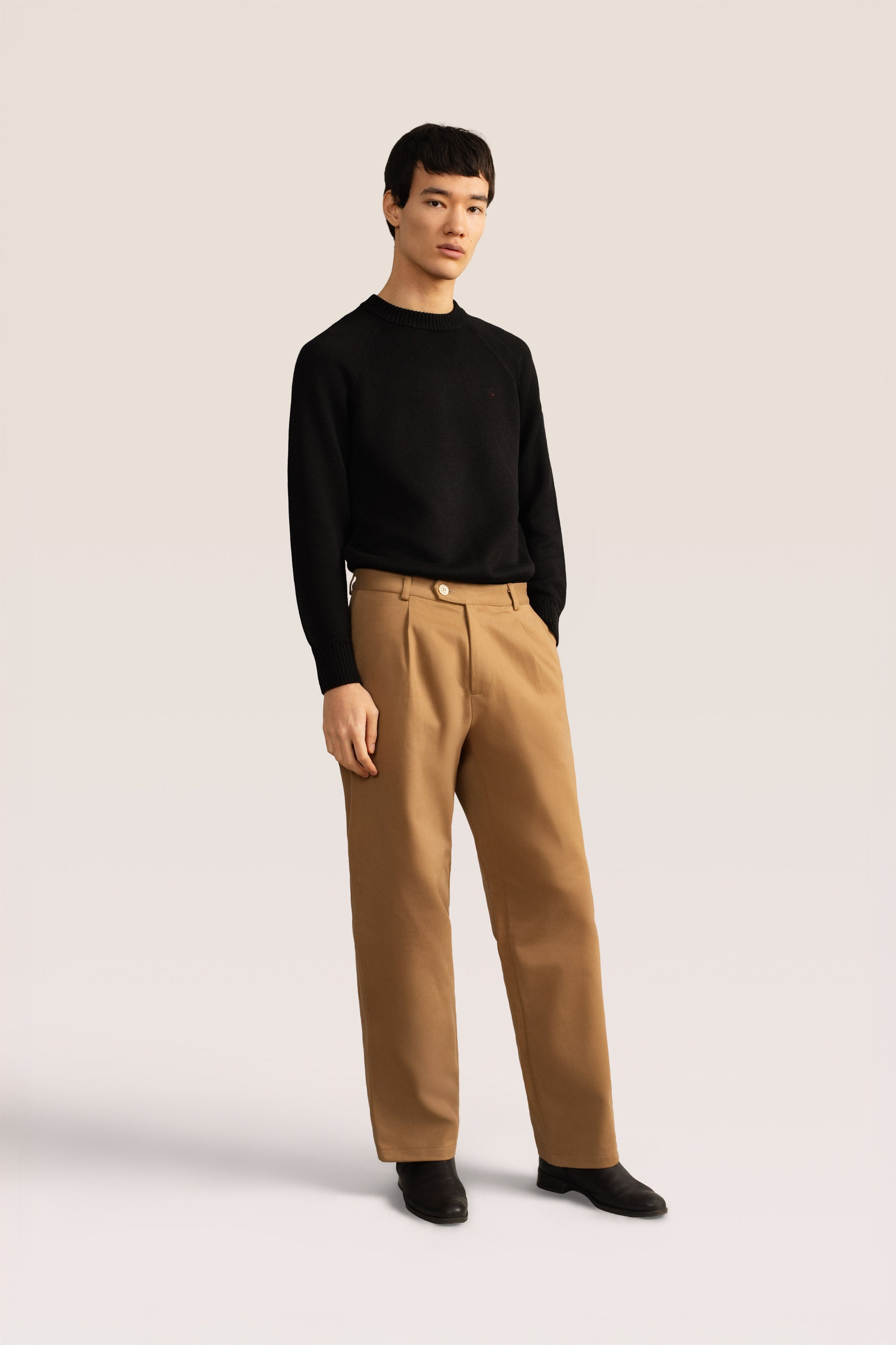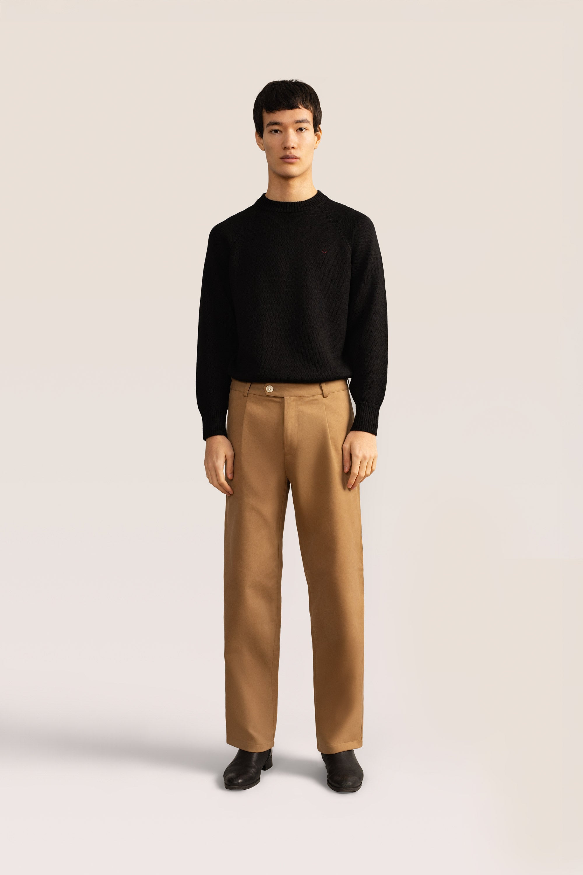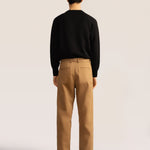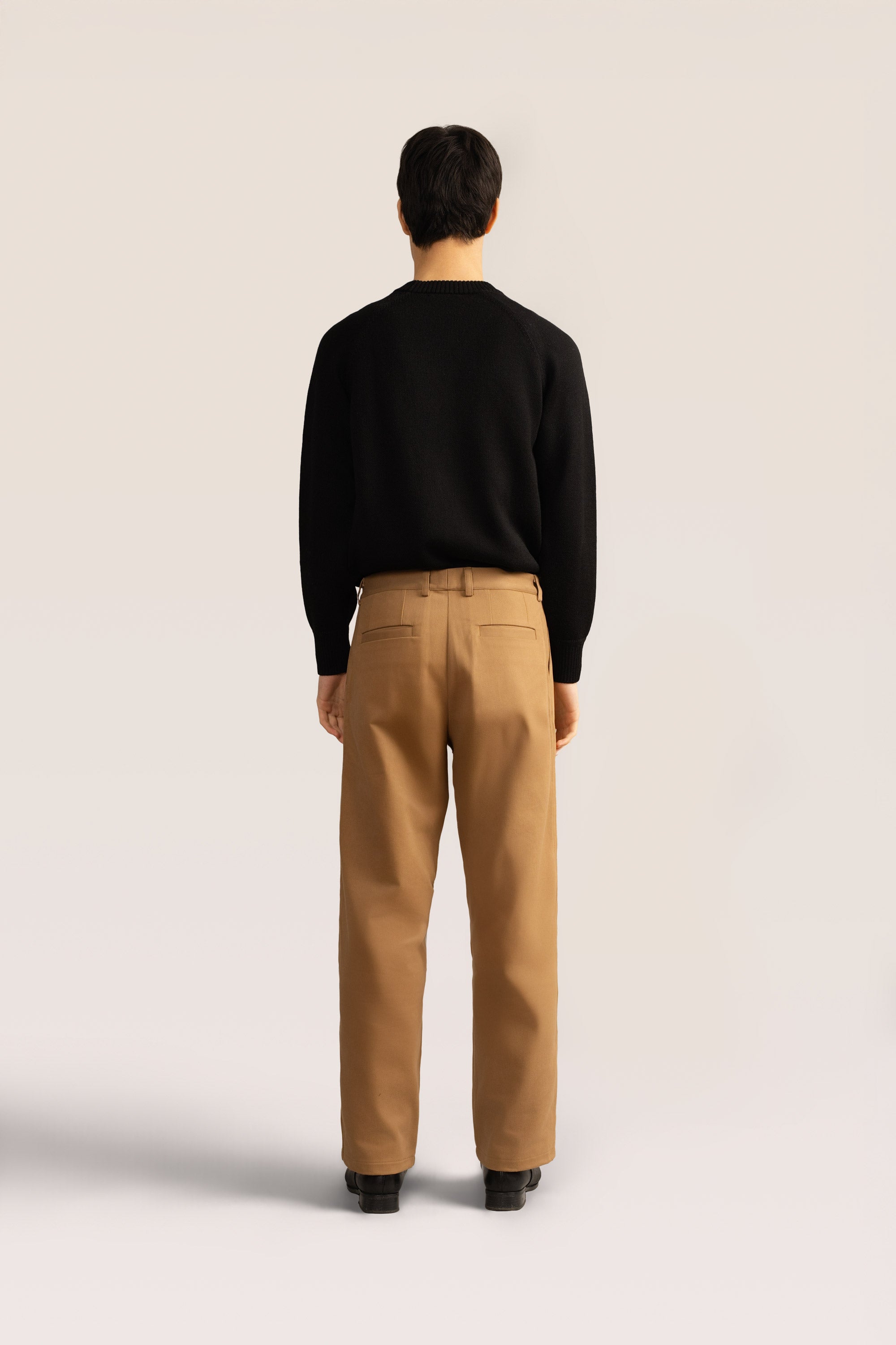 A relaxed straight-leg trouser cut from a heavyweight 350GSM Japanese satin cotton, finished with a soft peach-brushed texture on both sides. The fabric offers a dense, durable structure with a warm, velvety hand feel.
