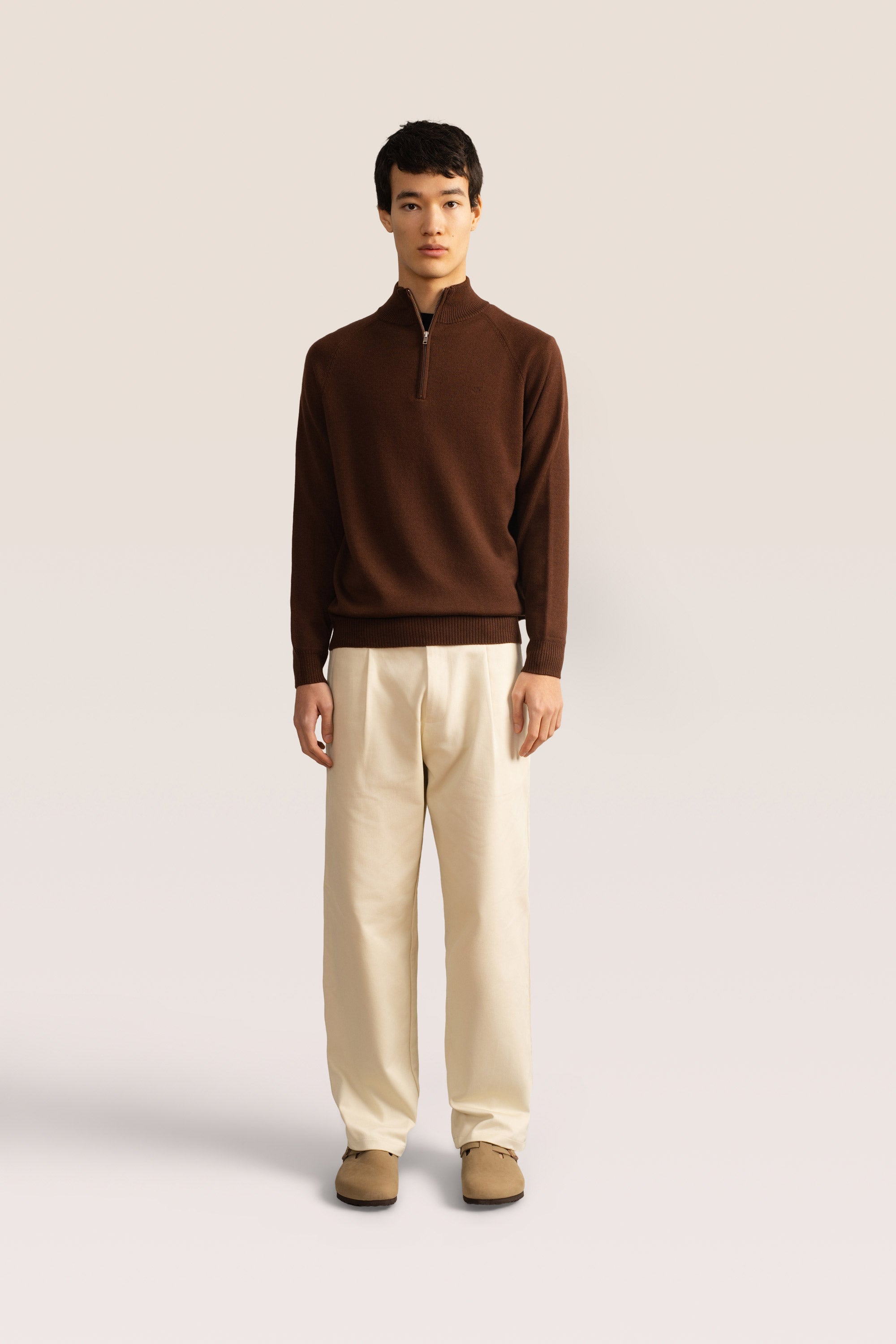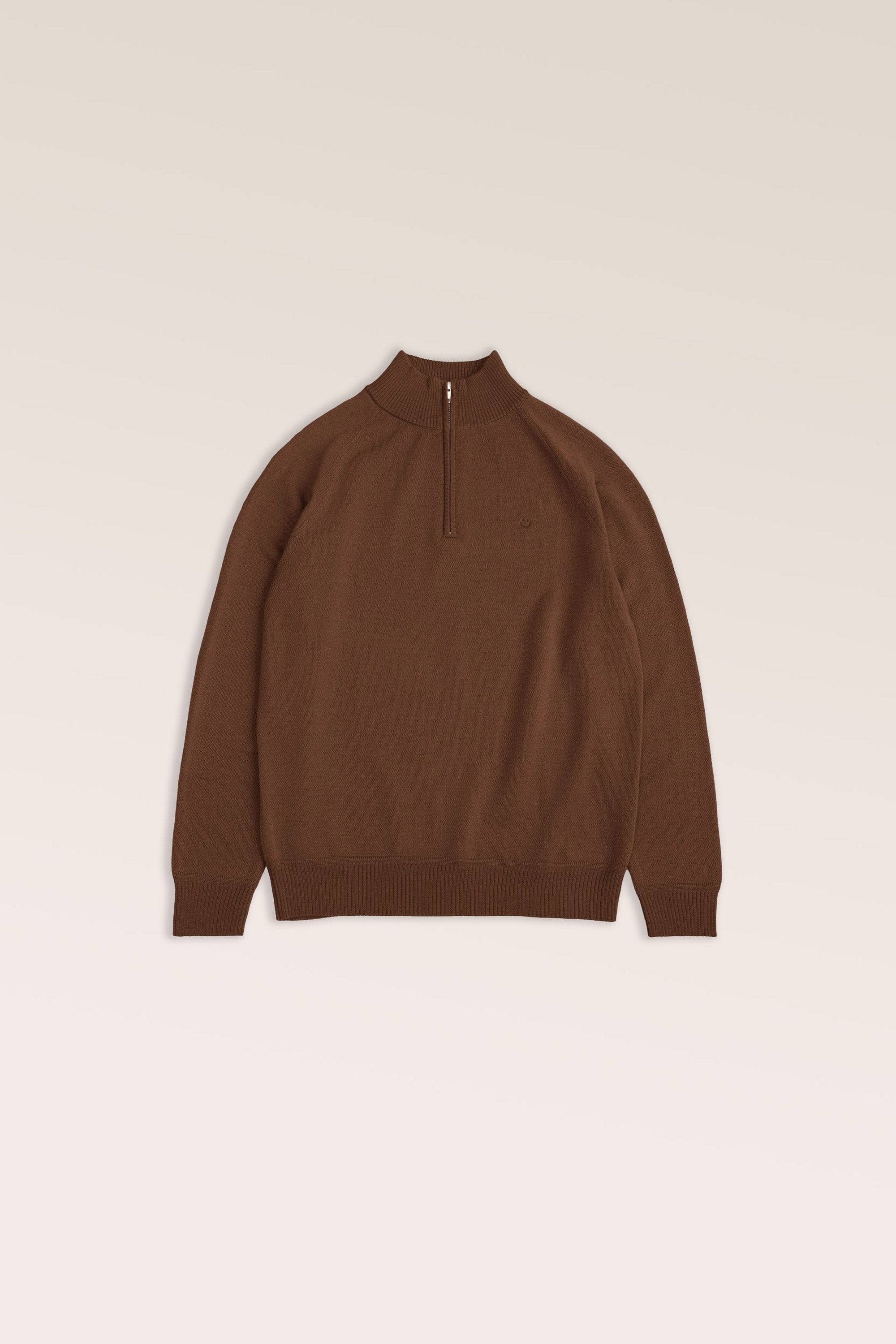Timeless essentials crafted for everyday elegance. Featuring a half zip mock neckline, refined ribbed cuffs and hem, and our signature smiley embroidery. Made with luxuriously soft, mid-weight Australian Merino wool for breathable comfort and natural warmth—perfect for year-round layering.