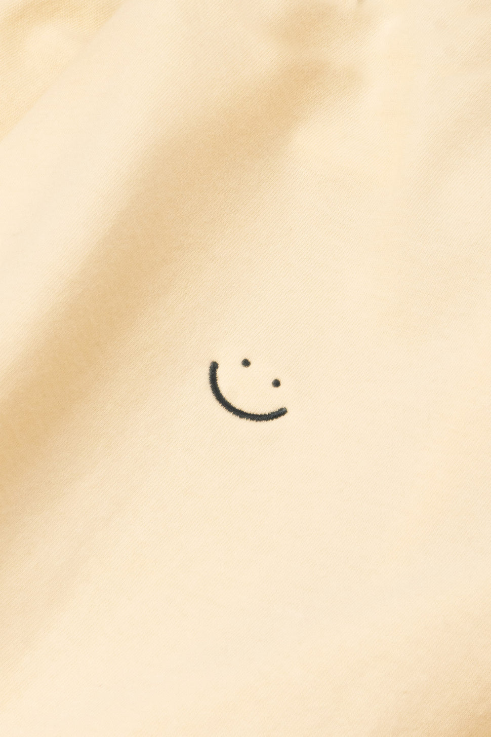 Our slim-fitting t-shirt features a curled raw rib neckline, unfinished edges on the sleeves and hem, and is made from GOTS certified organic cotton jersey. Pre-washed for a premium ready to wear finish, maintaining its shape and softness over time. Embroidered with our signature smiley. Designed and made in Australia.